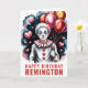 A beautifully stylized illustration of a whimsical male Pierrot clown, featuring pastel pink and blue hair, soft makeup, and a classic black-and-white ruffled costume accented with bright red hearts. Surrounded by floating hearts and glossy balloons, this dreamy artwork creates an enchanting, theatrical birthday mood. The design includes the message “Happy Birthday Remington” in bold red lettering, making it a striking and artistic birthday card for lovers of elegant clown imagery and fantasy-inspired aesthetics.