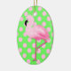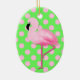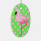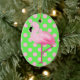 Colourful Christmas tree / decorator ceramic ornament, with graphics of a a fluffy looking pink flamingo, against a whimsical bright green with pink polka dot background. Add any text you want by customising this ornament. Fun gift idea for any flamingo lover.