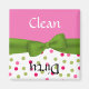 Cute pink and green clean / dirty dishwasher magnet. A solid pink background, on top, and a pink and green polka dot pattern, on the bottom of the magnet separated by a green ribbon and bow, running across the middle. Black text reads Dirty and white text reads Clean on opposite ends. Makes a great hostess gift.