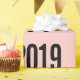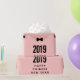 Wrapping paper celebrating the Chinese New Year. A big pink pig face wearing a formal bow tie. Lifted up by his black cloven hooves and peering over a table. Cute and whimsical drawing. Set on a pink background with faded hearts. Ready to celebrate the year of the pig 2019.