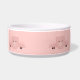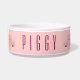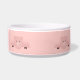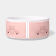 A personalised pet bowl with a drawing of a cute pink pig's face. Lifted up by his black cloven hooves and peering over at you. Cute and whimsical drawing. Set on a pink background with some faded hearts here and there.