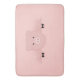 A bath mat with a drawing of a cute pink pig's face. Lifted up by his black cloven hooves and peering over a table. Cute and whimsical drawing. Set on a pink background with some faded hearts here and there.