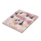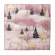 A ceramic tile illustrated winter landscape in a dreamy pink palette, featuring rolling blush-toned snow hills, elegant deer with golden antlers, and a mix of pink deciduous trees and deep blue evergreens. White-and-gold fantasy towers rise in the distance, adding a magical storybook feel. Falling snowflakes, snowy shrubs, and soft color contrasts create a modern, whimsical winter aesthetic
