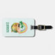 A luggage tag with an adorable illustration featuring a smiling green and gold pot with a cute rainbow,