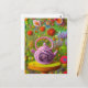 A whimsical postcard featuring AI generated artwork of a quilled teapot on a brightly coloured floral landscape.