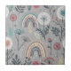 Whimsical Rainbow and Botanical Ceramic Tile - Playful seamless pattern featuring rainbows, dandelions, and wildflowers in soft pastel shades of pink, teal, and cream on a calming grey background. Perfect for nature lovers, boho style enthusiasts, and those who enjoy cheerful, uplifting designs. Ideal for spring, summer, birthdays, and whimsical-themed events.