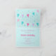 These 5th birthday party invitations feature a cute whimsical unicorn design. The unicorn has a colourful mane and flowers. There is bunting and confetti decorations on an aqua background. Personalise the front and inside of this invitation with your own text.