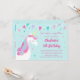 This 5th birthday party invitation features a cute whimsical unicorn design with pink purple and aqua mane and flowers. There is bunting, stars and confetti on an aqua background. Personalise it with your own text.