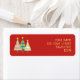 Add a festive touch to your holiday mail with this whimsical red return address label featuring three patterned Christmas trees topped with gold stars. The bold red background and playful font make it perfect for family Christmas cards, holiday party invitations, or gift packages.
