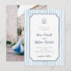 This whimsical wedding invitation features a navy blue hand drawn frame against a light blue striped background. At the top of the invite, there is a doodle scribble illustration of a diamond ring in a seashell ring box. The details follow with the couple's names in charming script lettering. Ideal for summer, italian, beach, yacht, and coastal wedding themes. Cards reverse to an engagement photo of your choice. Edit most wording and text colors to make this sweet wedding invite fit your event needs and personal style. View the collection linked on this page for the full wedding suite or visit our store for more wedding invitations.