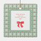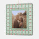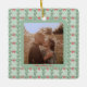 This stunning, vintage style holiday ornament features a colourful, whimsical Christmas design. The front of the ornament features your favourite personal photo, and a matching red and green retro holiday pattern with a light green background makes up the outer frame. On the back, a bright red trendy bow decorates the centre along with your name and your special date.