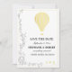 Elegant whimsical gold hot air balloon-themed illustrated 'Save the date' card.