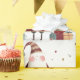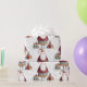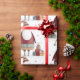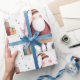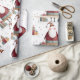 "A playful and festive wrapping paper pattern featuring a whimsical Santa Claus with a jolly smile, rosy cheeks, and a fluffy white beard. Santa is holding a stack of colourful Christmas gifts wrapped in red, green, and gold paper with ribbons and bows. The background is light blue with snowflakes, candy canes, and stars scattered around for a cheerful holiday vibe. The design is seamless and repeating, perfect for wrapping paper."