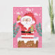 A cute pink Christmas card featuring a whimsical watercolor Santa Claus at the top of a chimney , holding 3 presents in one hand and a bell in the other . Personalise it with your own Holiday text inside .