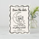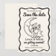 Whimsical and fun Over the Moon wedding save the date invitation card featuring a bride and groom toasting to their happy future.