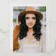 Invite guests to your event with this customisable gold foil-pressed graduation party invitation. It features whimsical calligraphy. Personalise this photo graduation invitation by adding your photo, name, school names and other details. This gold foil graduation invitation is perfect for high school and university graduations.