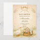 A charming storybook-style baby shower design featuring a sweet watercolor goose standing beside a nest filled with pastel eggs. Delicate spring flowers and soft greenery create a gentle countryside scene, while a blush bow and sage gingham background add a cozy cottagecore touch. The vintage illustration style and soft pastel palette give this design a whimsical nursery feel, perfect for a playful and heartwarming baby celebration.