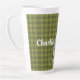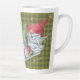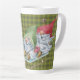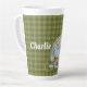 Winter / Holiday themed mug features watercolor illustration of cute gnomes sledding on dark green gingham plaid background. Personalise with customisable white text