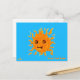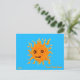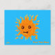 A happy, smiling, whimsical image of the sun on a blue background. Add your own text.