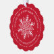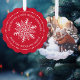 Christmas ornament card featuring a white, whimsical, folk art style snowflake inside a dot border and your custom photo. Customisable text "Wishing you a very merry Christmas". White text on a red background.