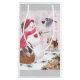 A cheerful snowman adorned with a red hat and scarf stands amid a snowy scene, holding a basket with two bunnies. A bird flies nearby holding an envelope with a heart, while a puppy looks up at them eagerly. Festive holiday gift bag by judithchengart