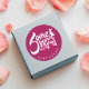 Brighten someone's day with our Classic Round Sticker featuring the delightful pun, "Somebunny Loves You." This charming design showcases a white bunny silhouette paired with elegant typography, all set against a vibrant magenta background. Perfect for adding a touch of whimsy to your belongings or as a thoughtful gift. Plus, the name is fully customisable—replace it with your own or that of a loved one for a personalised touch.