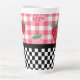 Whimsical Spring / Summer themed mug features top half of red and pink strawberries on pink gingham and bottom half of black and white chequerboard.