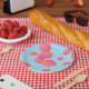 This charming strawberry design features perky illustrated fruit on a blue background.