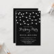 This elegant and whimsical birthday party invitation features white hanging fairy lights on a black background. Personalise by adding your details. This black and white birthday invitation is perfect for outdoor birthday parties.