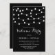 Elegant and whimsical welcome party invitation featuring white hanging fairy lights on black background. This invitation is perfect for nautical-themed and outdoor events.