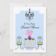 © 2013 Socialite Designs. A whimsical tea party invitation design which includes a floral tea set, damask tablecloth and chandelier.