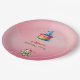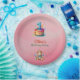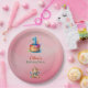 This is a pastel-themed birthday paper plates featuring a dreamy sky background with soft clouds. At the centre, there is a colourful cake with a large number "1" candle, symbolising a first birthday celebration. Cute teddy bear illustrations decorate the corners, adding a playful touch. The text invites guests to celebrate a child's first birthday. Perfect for a whimsical and adorable first birthday party invitation. Customise for a personal touch!