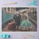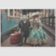 This enchanting image captures two anthropomorphic mice dressed in vintage attire, standing on a train platform. The mouse on the left, donned in a formal black suit and top hat, holds a red suitcase, exuding an air of sophistication. The mouse on the right wears an elaborate green dress with lace details and a wide-brimmed hat adorned with flowers, adding a touch of elegance. The vintage train carriage in the background enhances the nostalgic and whimsical feel of the scene, blending human-like fashion with charming animal features.