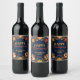 An elegant Thanksgiving wine label featuring a rich navy background framed by a border of golden and orange leaves and red berries. A whimsical pair of stylised turkeys flanks the customisable text for your family name and the year, adding a playful touch. This design transforms any bottle into a personalised centerpiece for your holiday table.