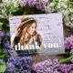 Simple and whimsical graduation thank you postcard features white typography and one full photo on the front, and a thank you message with return address on the back.