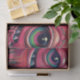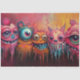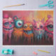 Set against a vibrant background transitioning from red to purple hues with splashes and drips of paint, these whimsical monsters add a touch of playful charm to any collection.