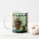 This whimsical coffee cup features a charming image of a small, fluffy bird with large, expressive eyes and messy, wiry feathers standing on a table. The bird is gazing directly at the camera with a slightly bewildered expression, adding a humourous touch to the design. Next to the bird is a white coffee cup with steam rising from it, indicating that the coffee is hot. The background of the image includes a window with soft, diffused light coming through, creating a warm and cosy atmosphere. This delightful and quirky design is perfect for anyone who appreciates a good laugh with their morning coffee.