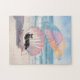 Piece together seaside charm with this whimsical watercolor puzzle featuring a black cat lounging in a seashell under a colourful umbrella. Rendered in soft pastel pinks and blues with gentle ocean waves and warm sunshine, this playful artwork is full of coastal personality.