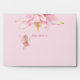Soft pink on the outside with a little flower fairy and a delicate flower the envelope features in the inside a magical watercolor design with little fairies in pink floating over flowers in different shades of pink and white. The fairies have delicate wings and wear colorful dresses while they are surrounded by fragrant flowers in soft and bold colors.