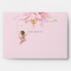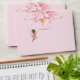 Soft pink on the outside with a little flower fairy and a delicate flower the envelope features in the inside a magical watercolor design with little fairies in pink floating over flowers in different shades of pink and white. The fairie have delicate wings and wear a colorful dress while they are surrounded by fragrant flowers in soft and bold colors.