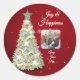 Send warm wishes this holiday season with our whimsical watercolor round Christmas Tree stickers. Add your favourite photo to personalise these cute additions to your gifts and letters. This delightful design showcases a beautifully illustrated Christmas tree in rich green hues, ribbons ornaments and snowflakes. Set against a festive red starry background, this round sticker radiates holiday cheer. It’s the perfect style to share joy and warmth with family and friends.