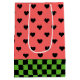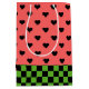 Whimsical gift bag features watermelon pink and black hearts pattern with dark green chequerboard bottom border.