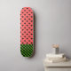 Whimsical skateboard deck features watermelon pink and black hearts pattern with dark green chequerboard bottom border.