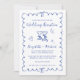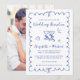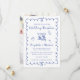 Romantic wedding reception save the date featuring a french blue wavy frame adorned with coquette bows, whimsical hand drawn illustrations of a heart, stars and wine glasses, and "Wedding Reception" and the names of the bride and groom in a playful blue script. Add your photo on the back.