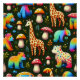 This vibrant pattern features a delightful arrangement of giraffes, bears, and mushrooms, all illustrated in a colorful style against a dark military green background. The seamless design offers a playful and whimsical esthetic, making it ideal for a variety of applications, such as textiles, wallpapers, and stationery. The combination of animals and mushrooms creates a charming woodland theme, appealing to both children and adults who appreciate nature-inspired art.