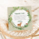 Cute watercolor woodland themed baby shower thank you card with a cute fawn and hedgehog on a greenery wreath and a light sage green background.