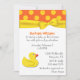 Cute shower invitation, done in a whimsical orange and yellow polka dot pattern, on the top of the invitation. Graphics of a yellow ribbon with bow runs across the top bordering the polka dot pattern, and a cute yellow rubber ducky, on the left bottom side. Personalise the text to suit your shower party needs.