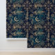 Trendy, magical gold dreamcatcher mandala floral pattern, featuring a collection of tribal feathers, mandala flowers, geometric flowers, the moon, the sun and the stars, circles, dots, squares, triangles, chevron zigzag, geometric shapes, a mandala with a protection eye, made with yellow gold and silver dots shining glitter sparkles mystical image, over a midnight blue, dark blue gradient starry glow background. This trendy, mystic, tribal, fashionable, fantasy illustration, bohemian girly design, is perfect for everyday wear, home decor, celebrations and special days theme decorations.