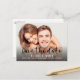 Whimsical and stylish save the date announcement with photo featuring black modern calligraphy script.