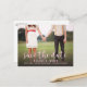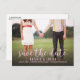 Whimsical and stylish save the date announcement with photo featuring white modern calligraphy script.